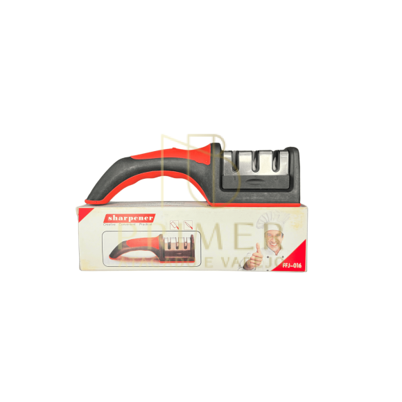Afiador de qualidade profissional e muito simples de usar. Cabo e base antiderrapante. Ideal para afiar facas e tesouras que possuem lâminas de aço inox.