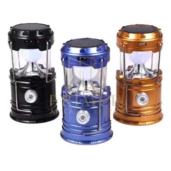 Luminária multifuncional, possui uma Lanterna de Led e um Lampião solar embutido. Pode ser carregada via solar ou através da eletricidade. Ideal para acampamentos, pescaria, emergências durante a noite, trabalhos diversos.